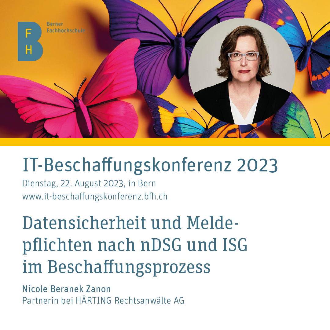 Nicole Beranek Zanon hält im Rahmen der zwölften IT-Beschaffungskonferenz am Dienstag, den 22. August 2023, an der Universität Bern einen Vortrag zum Thema „Datensicherheit und Meldepflichten nach nDSG und ISG im Beschaffungsprozess“.