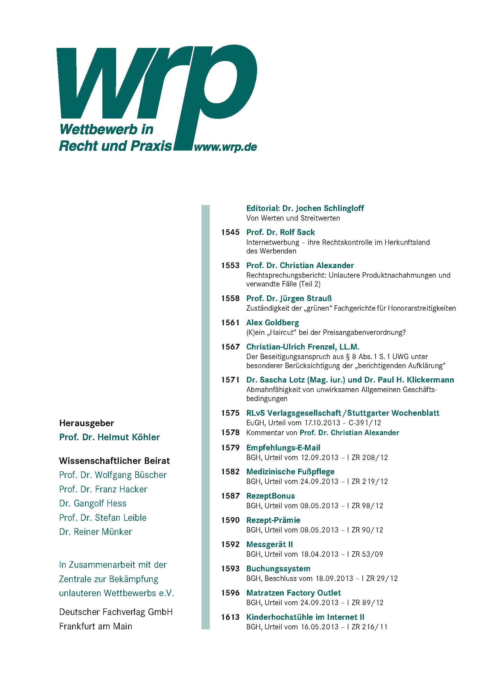 Den Aufsatz Schirmbacher/Schätzle, Einzelheiten zulässiger Werbung per E-Mail, WRP 2014, 1143 stellen wir Ihnen gerne hier als PDF zum Download zur Verfügung.