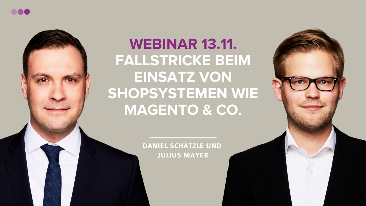 Wenn aber das Shopsystem vom Dienstleister nahezu vollständig geliefert wird, dann stellt sich auch die Frage nach dessen Verantwortung. Worauf es hierbei ankommt, werden die Rechtsanwälte Julius Mayer und Daniel Schätzle in ihrem Webinar erläutern.