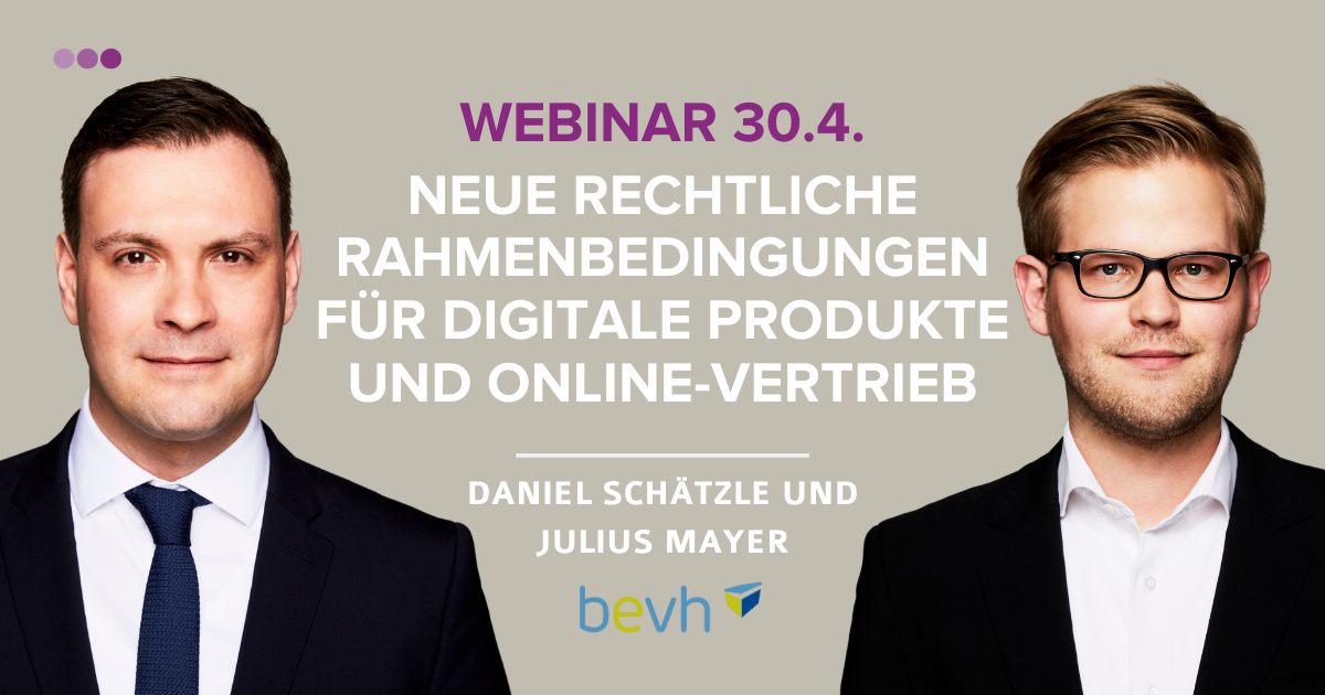 Die Rechtsanwälte Daniel Schätzle und Julius Mayer gaben in Ihrem Webinar am 30.4. einen Überblick zu den neuen rechtlichen Rahmenbedingungen, für wen und ab wann diese gelten und was bis dahin zu tun ist. Zu den Inhalten gehören etwa: