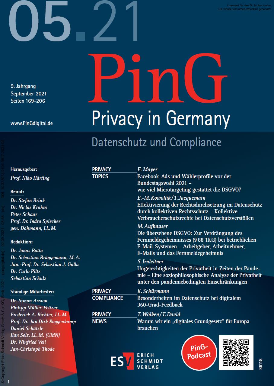 Die PinG-Ausgabe 5/2021 hält die neuesten Entwicklungen im Datenschutz für Sie bereit. Neben Microtargeting im Wahlkampf werfen unsere Autoren und Autorinnen einen Blick auf Themen in Zusammenhang mit der Corona-Pandemie, auf den Beschäftigtendatenschutz sowie den Digital Services Act.